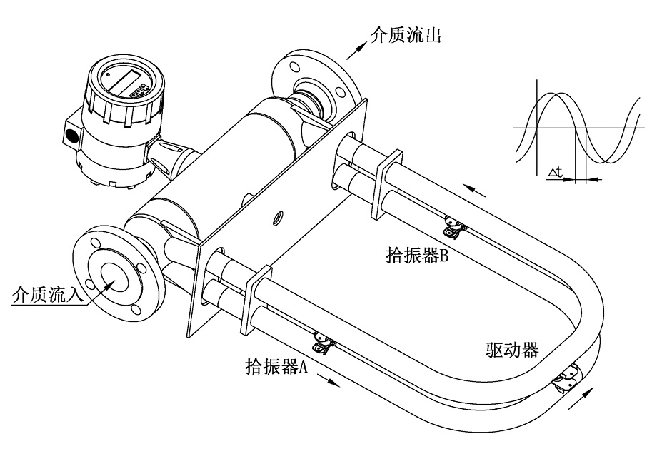 SYZLL系列質(zhì)量流量計(jì)(以下簡(jiǎn)稱流量計(jì))的結(jié)構(gòu)是雙彎U形管結(jié)構(gòu),其測(cè)量原理是:測(cè)量作用于雙彎管上的科里奧利力(簡(jiǎn)稱科氏力)所產(chǎn)生的相位差來(lái)檢測(cè)管道中的質(zhì)量流量。