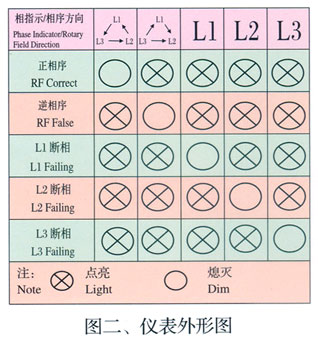 當(dāng)接通電源后,各相所對(duì)應(yīng)的指示燈點(diǎn)亮;如有缺相時(shí)對(duì)應(yīng)此相的指示燈會(huì)熄滅,且正序與逆序指示燈同時(shí)點(diǎn)亮。